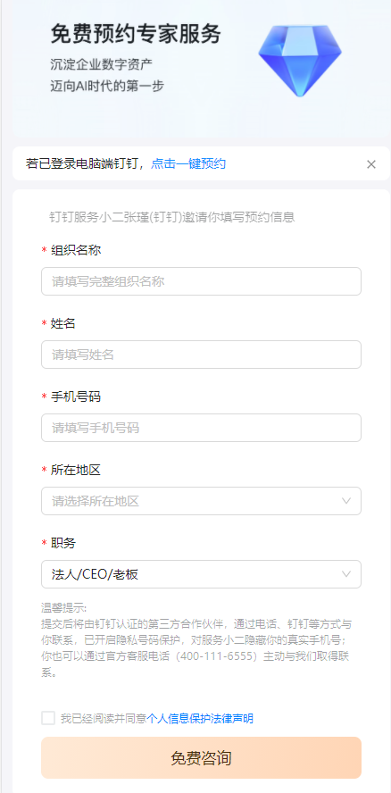 2、根据表单填写组织名称、联系方式等内容,点击咨询即可